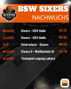 Sixers Girls wU14 gegen die Leipzig Lakers Am Samstag fand das Testspiel unserer Sixers Girls wU14 gegen die Leipzig Lakers statt. Das Spiel stand ganz im Zeichen des Testens, des Ausprobierens und des Findens des Spielflusses. Ganz ohne Schiedsrichter stand der Fair Play Gedanke an erster Stelle. Aus den geplanten vier Vierteln wurden spontan fünf, denn der Spaß am Spiel stand im Vordergrund. Das 5. Viertel wurde dann inoffiziell mitgezählt und ging mit 22:17 an die Sixers. Ein besonderes Highlight war der erste Dreier der Saison, den sich Lucia auf ihr Konto schrieb – Wette gewonnen!